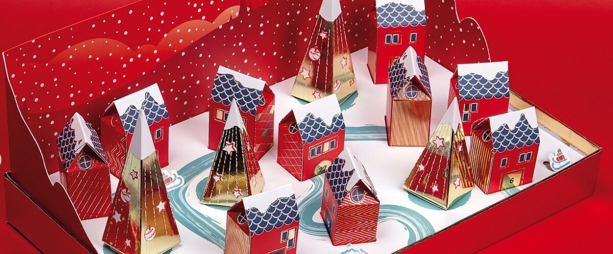 El calendario está compuesto de 10 casitas con capacidad para dos días (tejado y puerta) y 4 árboles de Navidad, que esconden un chocolate distinto (bombones, figuras con frutos secos, gominolas naturales, grajeas…).