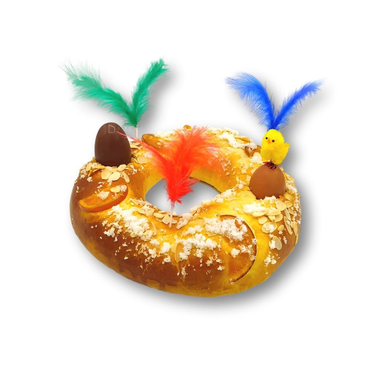 Bollo tierno elaborado artesanalmente, aromatizado con ralladura de naranja y acabado con almendras laminadas, naranja confitada y azúcar anisado.