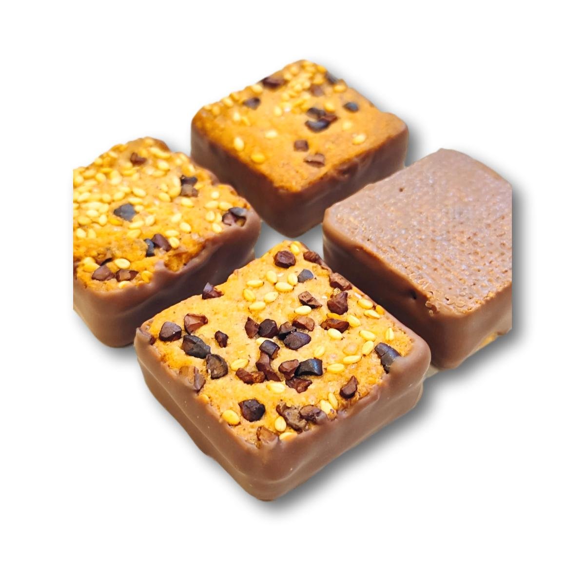 Está formada por dos galletas de avellana con sésamo y nibs de cacao, con un relleno de praliné de avellanas con un toque de lima y un puntito de sal. Todo ello recubierto con un delicioso chocolate con leche.